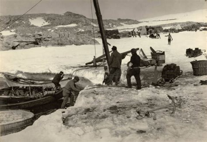 National Library of Australia Douglas Mawson and his men unload their supplies at Cape Denison.Circa 1911-1914.